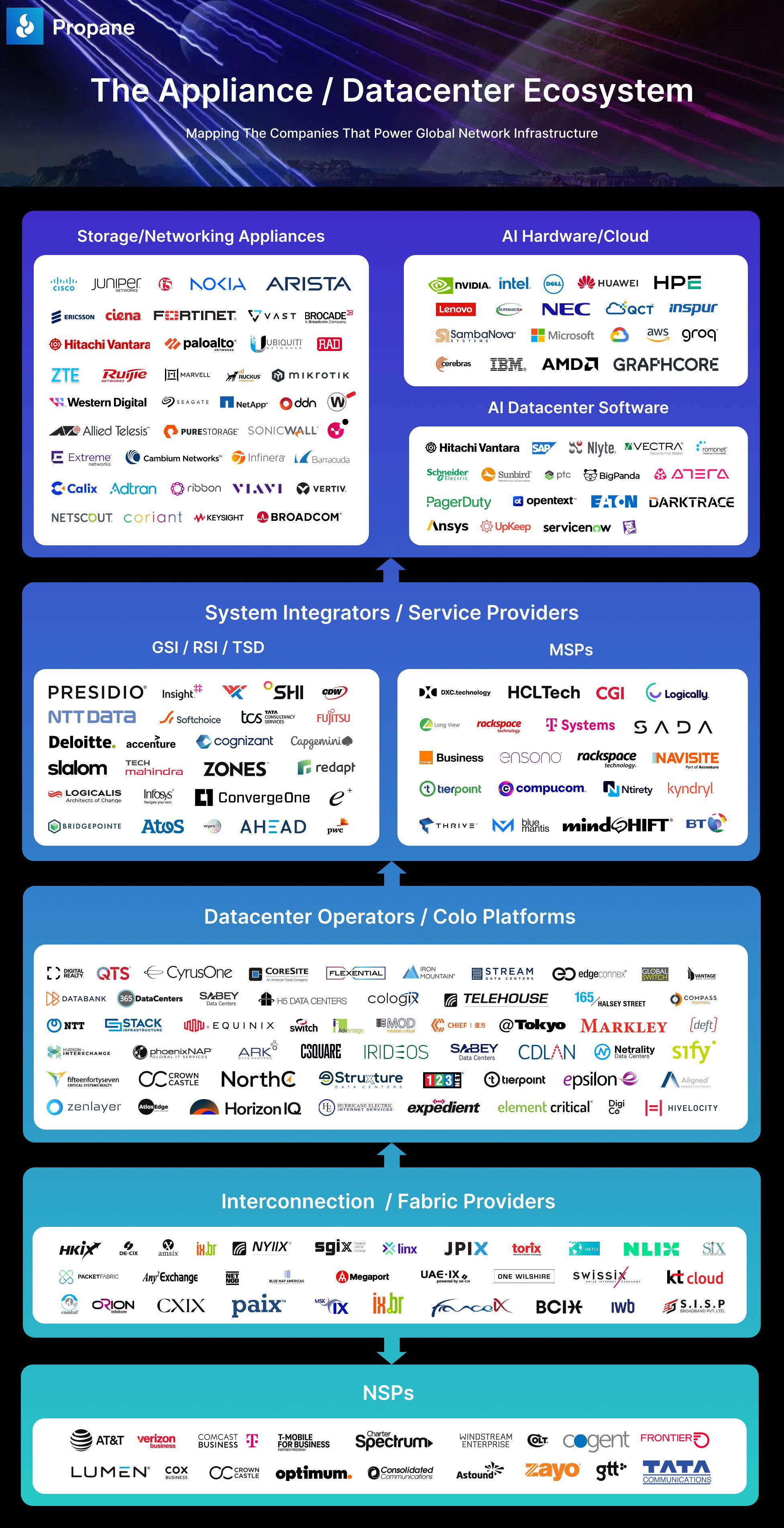 Every company on the map was selected based on their active presence in the ecosystem today. The full map represents the organizations that design, build, deploy, operate, connect, and manage datacenter infrastructure globally.